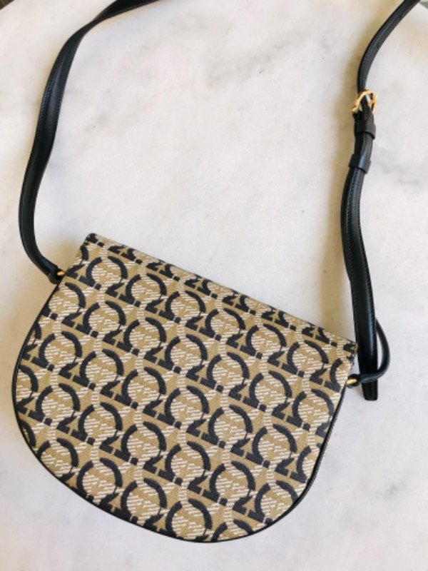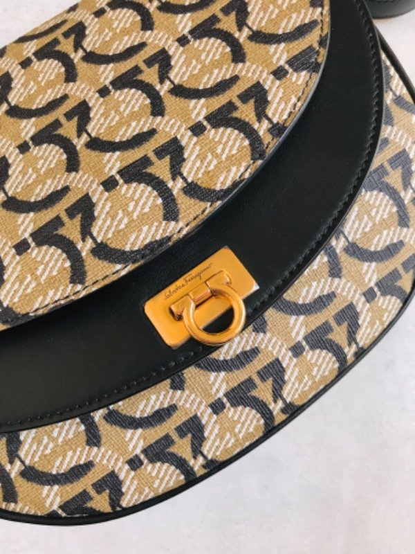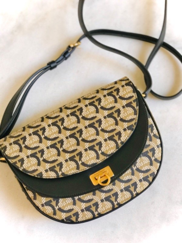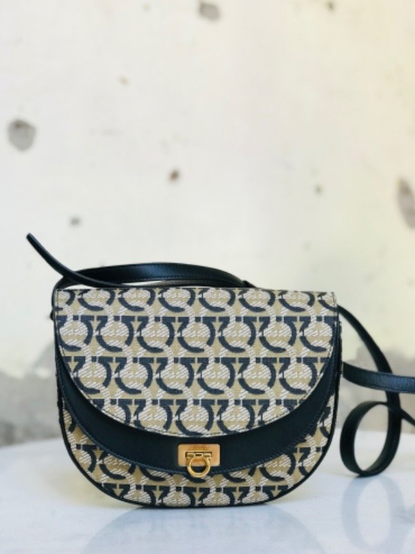 Salvatore Ferragamo edición especial 1927 con logo Gancini repetido en jacquard beige/negro y detalles en cuero negro.