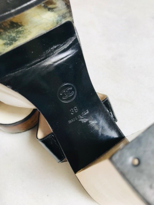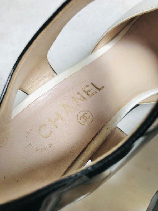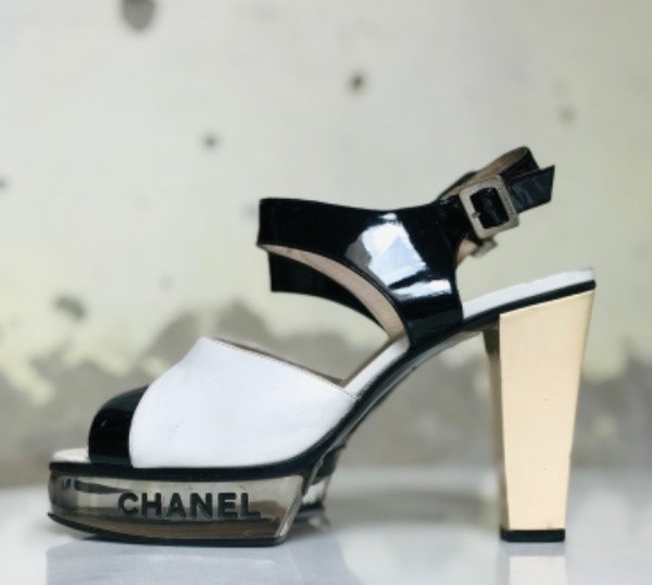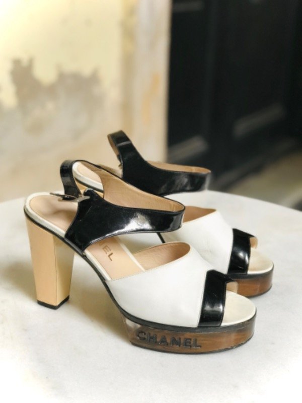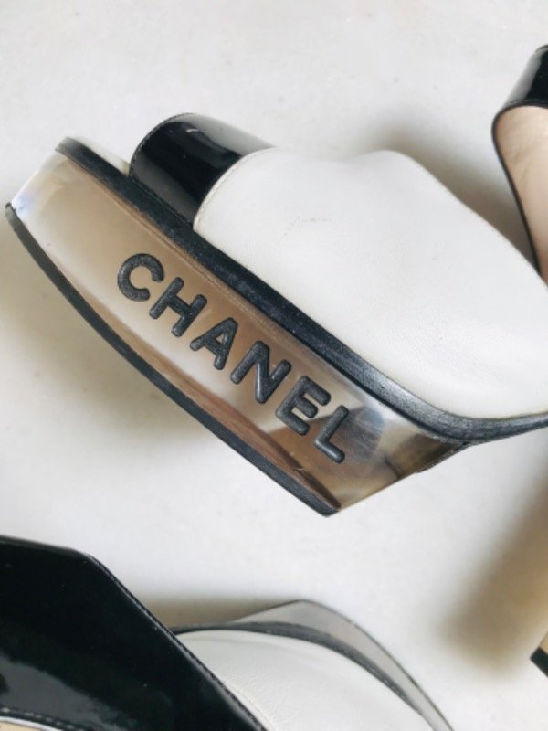 sandalias de plataforma Chanel bicolor (blanco/negro) con base de acrílico imitación madera y tacón alto recto.