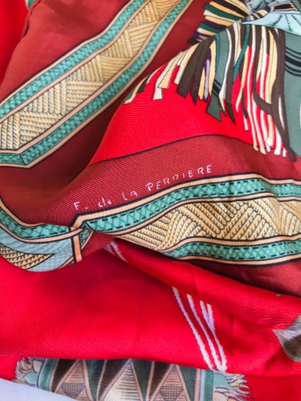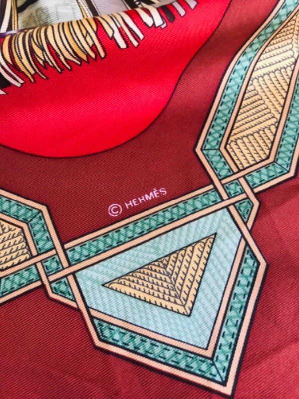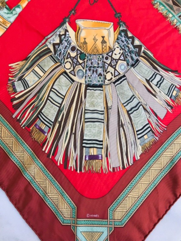 Descripción: Seda natural, fondo rojo intenso con motivos de talabartería y ornamentación tuareg del Sahara.